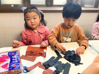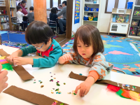 プリスクールの RR クラスと DD クラスの子どもたちが、サンクスギビングのクラフトに取り組んでいる様子です。