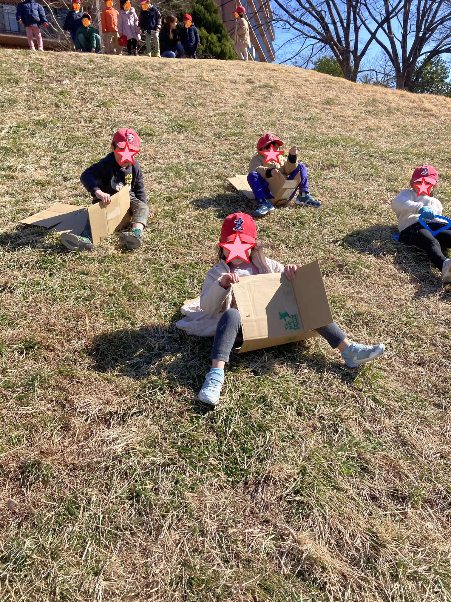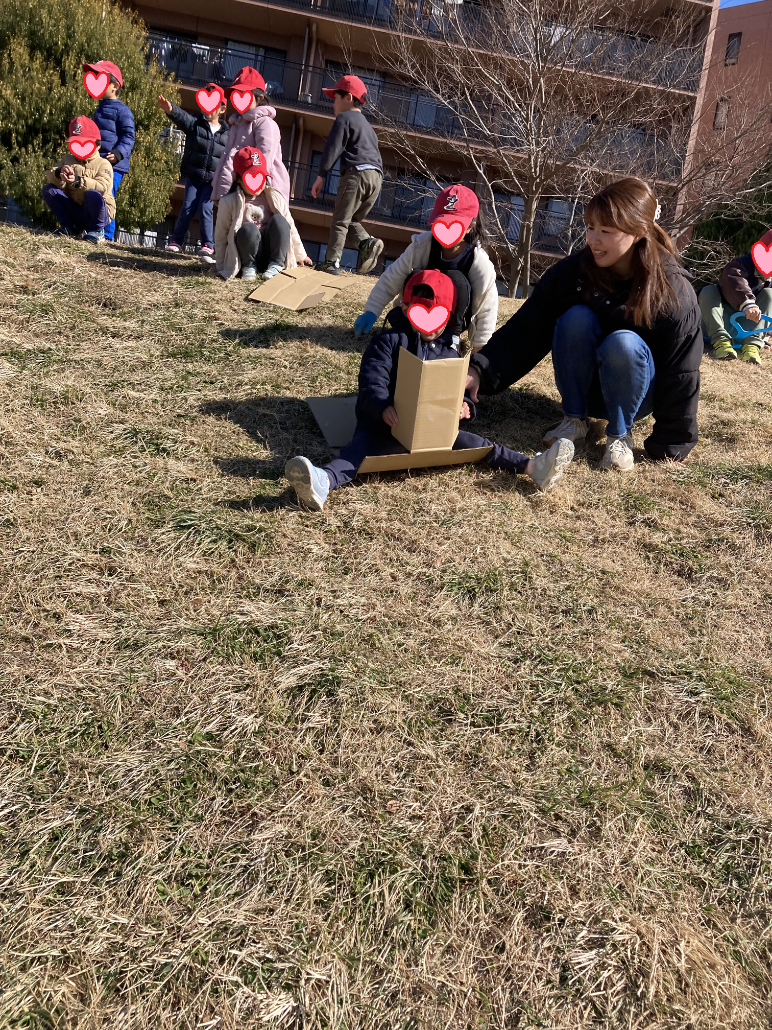 実は冬休みのロング保育中、Mr. Yoheiと一緒に行ったことのある公園だったので、今回は段ボールを持っていき、ソリ遊びで楽しみました。